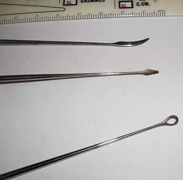 There are blunt and sharp probes (middle). The blunt probe was used for probing sinuses and the fine probe used for dilating salivary or lachrymal ducts. The alligator forceps were used for removing foreign bodies from ears.