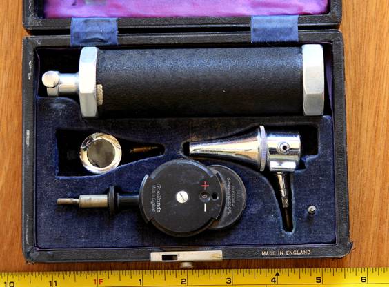 Opthalmoscope and Auriscope. The opthalmoscope was used to view the retina and eye structures while the auriscope was used to view the ear drum. the battery powered light source could be used to view the oral cavity and tonsils