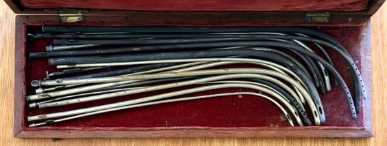 Haemorrhoid injection syringe: usually used in the surgery but patients in nursing homes and patients confined to home were also treated. The syringe was filled with a sclerosing agent usually phenol in almond oil and a small volume (about 2cc) was injected into the haemorrhoid. The needles had a narrow final 1.5 cm to prevent over penetration. Metal urinary catheters: before prostatectomy became possible, acute retention of urine was treated by catheter-isation. If a rubber catheter could not pass the enlarged prostate metal catheters were used; some had obturators to maintain patency (left hand side of box).