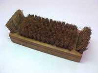 Large scrubbing brush with a wooden handle and straw bristles.