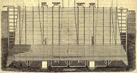 Perhaps the most famous use of caissons was the building of the Brooklyn bridge in 1871. In order to reach the bedrock under the East River (the deeper Manhattan side is about 24m below the waterline) a large wooden caisson was built on land, towed into the river, and sunk by building the pier on top of it. It was then filled with compressed air, allowing space for workers to excavate the ground below. After they had reached bedrock, the men left and the cavity was filled with concrete, becoming the foundation for the pier. Brooklyn Bridge Caisson, from US Library of Congress
